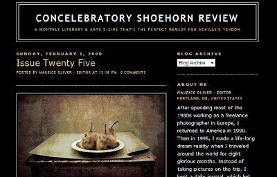Issue #25 of Concelebratory Shoehorn Review (editor: Maurice Oliver) is now online. Read poetry by Rob Walker, Aimee Nezhukumatathil, Matt Cozart, Joanne Merriam, Thom Donovan, Paolo Manalo, and Molly Arden. Also included in this issue is the photography of Stefan Seith and the art of Daniel Colvin.