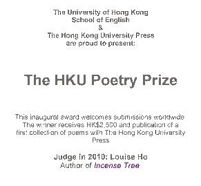 The University of Hong Kong School of English & The Hong Kong University Press are proud to present the HKU Poetry Prize. This inaugural award welcomes submissions worldwide. The winner will receive HK$2,500 and publication of a first collection of poems with The Hong Kong University Press.
