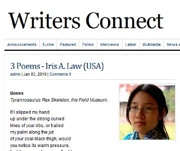 Iris Law’s three new poems, “Bones”, “Airport, T-Minus-Four Hours” and “Spare the Air Day” are now published in the Singapore-based Writers Connect. You can read the poems