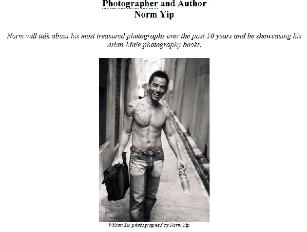 Chinese-born-Canadian, Norm received his Bachelor of Arts degree (cum laude) in 1984 at the University of Saskatchewan, and his Bachelor of Architecture degree in 1989 at theUniversity of Toronto. Moving to Hong Kong in 1994, he worked as a project architect for Wong & Tai Associates Ltd and RTKL International Ltd before pursuing his interest in art and photography. In 1999, he co-founded the organization art collective Meli-Melo Artists Alliance (MMAA), to which he curated numerous art exhibitions with artists from Canada, Thailand and Hong Kong. Norm is known for his monochromatic images of the Asian male physique and face, and in 2005 and 2007, he self-published two photography books entitled The Asian Male —1.AM and The Asian Male — 2.AM. Norm has taught photography at Hong Kong’s Open University LiPACE and has been a guest lecturer at Hong Kong Art School. Norm’s work has appeared in HK Magazine, WHERE, Global Investor and American Express’ Centurion magazine. Celebrities he has photographed include Zhang Yimou,Jennifer Lopez, Ricky Martin, Destiny’s Child and Korean pop-star Rain.