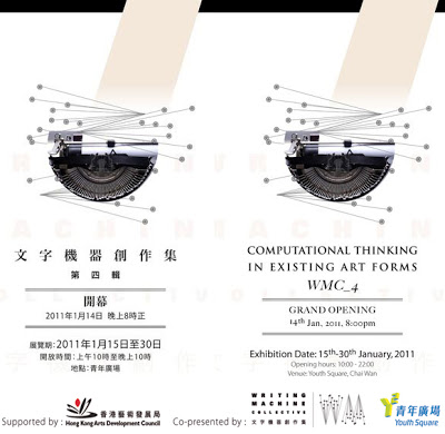 The Writing Machine Collective 4th edition (Jan 14-30, 2011) promises to be a fresh and thrilling showcase of crème de la crème local media arts talents. 15 artists come together to offer us 12 unique works that explore how something so crucial to everyday life, the computer, can be an artistic medium.