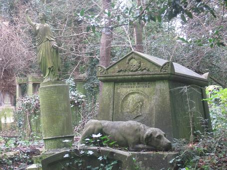 8) Another stop we made in the main part of the cemetery was at the grave of Thomas Sayers, the famous nineteenth-century bareknuckle boxer. His funeral was believed to have been attended by thousands of fans, an impressive feat for a time in which boxing was officially illegal. Sayers’s most famous fight was against the American John C. Heenan; the fight was advertised as the championship of the English-speaking world. The fight went on for two hours and twenty minutes (37 rounds) before it was finally broken up by police and called a draw. After the fight, Sayers’s fans raised money for him to retire from boxing. He spent his last days going from pub to pub with his dog, Lion, buying drinks and being bought drinks. Lion is featured on his grave as a loyal friend and guardian.