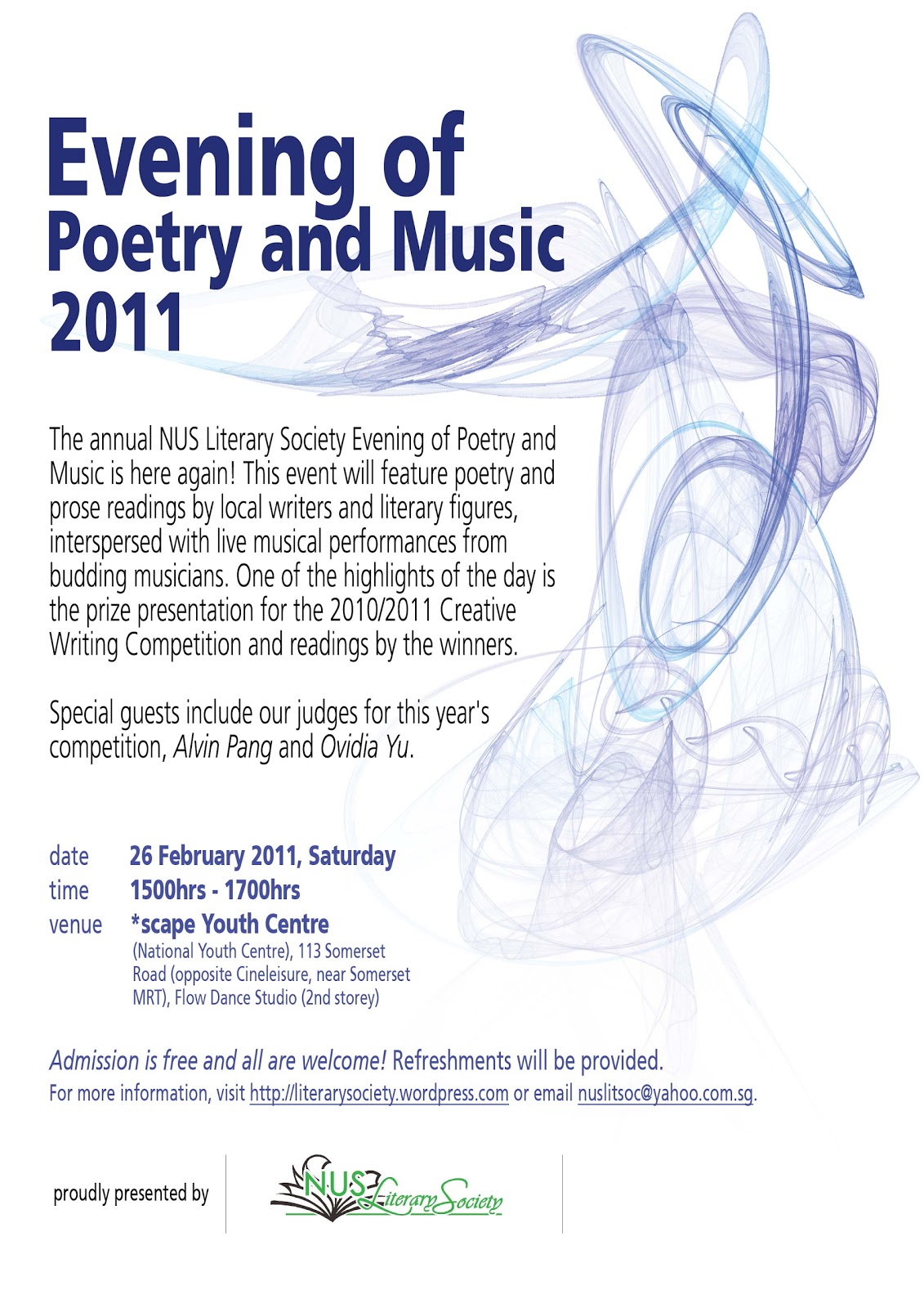 The annual NUS Literary Society Evening of Poetry and Music will feature upcoming writers and literary figures, interspersed with live musical performances from NUS music groups. Also included in the EPM will be the prize presentation for the ’10/’11 Creative Writing Competition and readings by the winners.