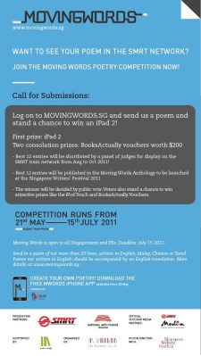 The Literary Centre, a Singaporean not-for-profit organisation has initiated a new project in collaboration with SMRT- Moving Words 2011 – to feature poetry written by Singaporeans in SMRT trains and stations.The Moving Words Poetry Competition is calling for entries that will stand to get displayed in the SMRT network and published in the Moving Words Anthology to be launched at the Singapore Writers’ Festival.