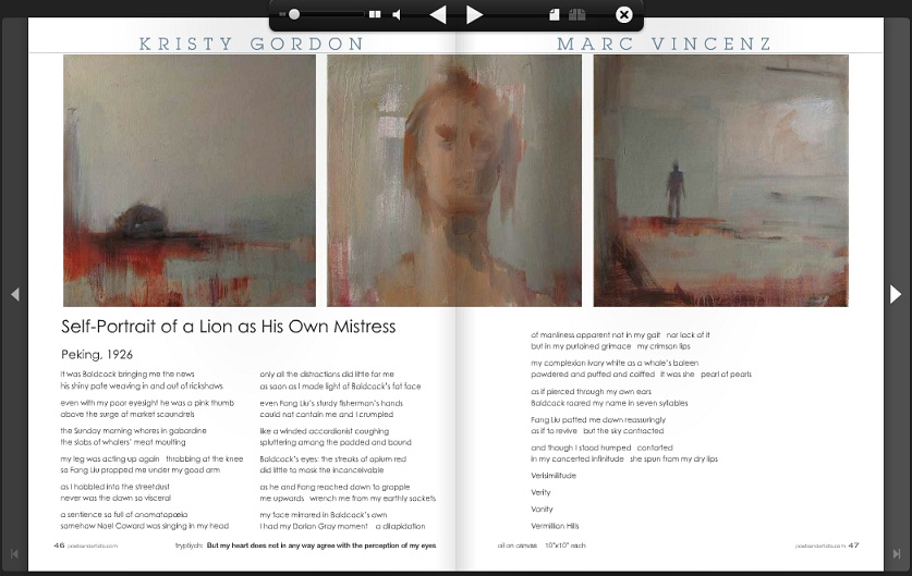 Marc Vincenz’s new poem “Self-Portrait of a Lion as His Own Mistress” (pp. 46-47) with an audio in synergy with Kristy Gordon’s triptych “But my heart does not in any way agree with the perception of my eyes” can be found in the new issue (“2011 Collaborative Issue”) of Poets and Artists. You can listen to the audio here.