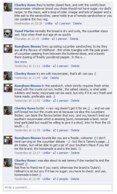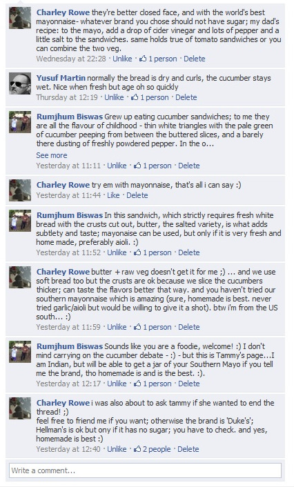 UPDATED: There was a very interesting discussion about the ingredients for a good cucumber sandwich on Facebook. I hope the discussants don’t mind my sharing it here:
