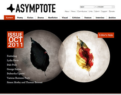 The October 2011 issue of Asymptote is now live. It features Murakami, Milosz and Szirtes, Lydia Davis’s first Dutch translations, essays by Dale Peck, various Burmese poets, Piyush Daiya, primers on Croatian novels and Eileen Chang, their first English Poetry Feature, an interview about the Arab uprisings and a video with sounds from outer space. Read the new issue here.
