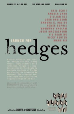 Saturday, March 17th at 7pm, come to D&Q to celebrate with graduate students of Études anglaises (Université de Montréal) as they launch their new literary chapbook, HEDGES.