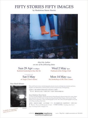 Fifty Stories Fifty Images, Madeleine Marie Slavick’s new book published by MCCM Creations, is a collection of prose and photography. It presents insects and high rises, dentists and trees, laughter and abstractions, and the poetry, poverty and generosity of Madeleine’s beloved city, Hong Kong. In late April and the first half of May, Madeleine will be appearing at several book events. Please click on the image above to see the dates and venues.