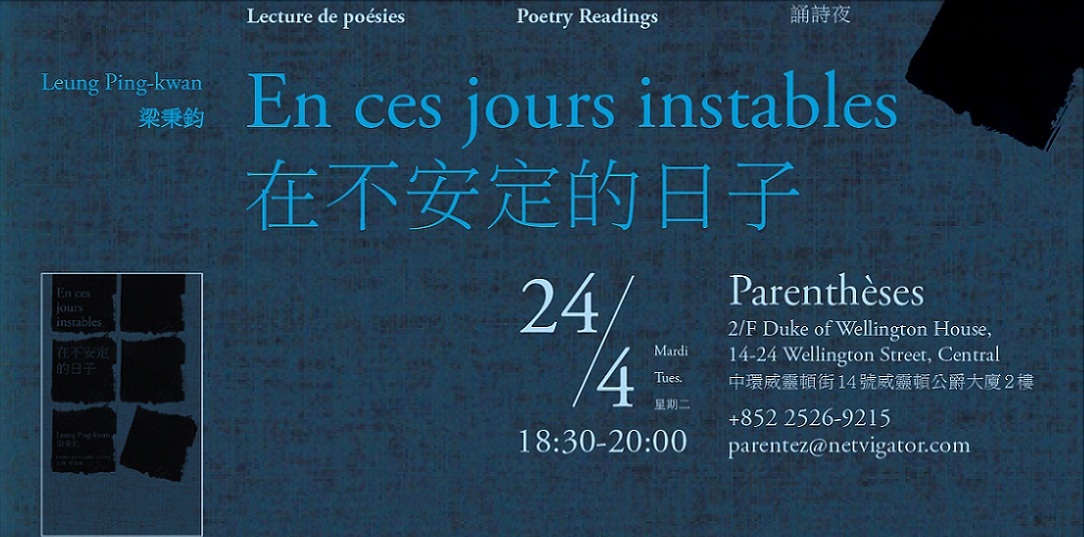 You are cordially invited to attend the book launch and reading of Leung Ping-kwan’s new poetry book En ces jours instables, a collection of eighteeen Chinese-French poems published by MCCM Creationsin April 2012. Poetry readings in French and Chinese with Ping-kwan and the French translator Camille Loivier.