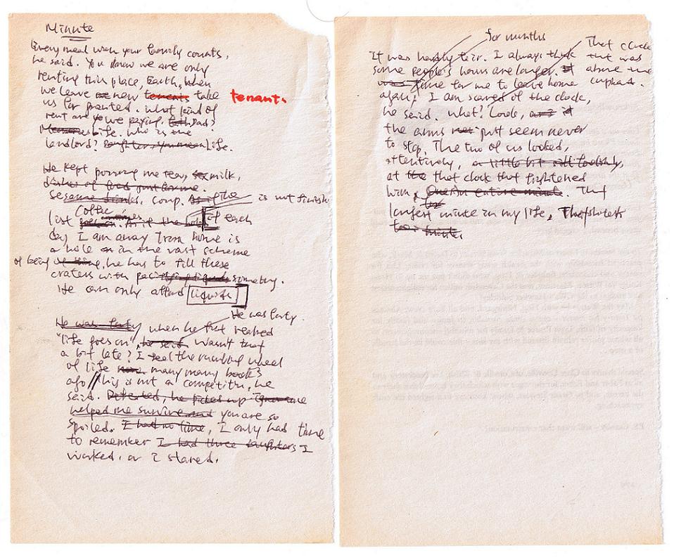 Fig. 3 “Minute,” 2007. This draft was done on the 969 Citybus from Tin Shui Wai (my parents’ home) to Sheung Wan (where my apartment was at the time). I finished the poem quickly—an outburst of sad feelings. You might find the texture of the paper interesting—I wrote on the back pages of a Victorian novel (my own copy!), now sadly two pages short. The final version of this poem, which can be read here, was published in Muse in January 2008.