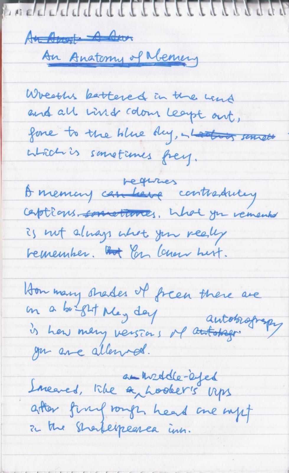 I think he was right—not because I delude myself with fantasies that someone will have idle, romantic or scholarly interest in them once I die, but because they retain the aura of the time when I first conceived the poem. Although this aura is of no significance to others, it is invaluable to me. Take “An Anatomy of Memory” as an example—I wrote it in a car while travelling near Glenshee, Perthshire, in May 2011. The discoloured wreathes, the blue sky and the many shades of green were all drawn directly from what I saw, although not the hooker, who I invented and randomly turned from ageless to middle-aged. (There was an inn that looked like it could have been built in Shakespeare’s time, though.) The handwriting, done on that late May morning, connects me intimately to the morning itself; it precisely conjures the time, the place, the people, the smell, the dots, the weather, the sounds, the carelessness of “The Anat” and “A Ana,” the carsickness from writing in the backseat.