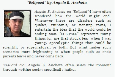 Cha is nominating Tom Mangione’s “People are Fundamental” and Angelo B. Ancheta’s “Eclipsed”, both published in Issue #19 of the journal, for The Micro Award 2012. Congratulations and good luck!–