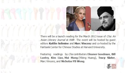 There will be a launch reading for the March 2013 issue of Cha: An Asian Literary Journal at AWP. The event will be hosted by guest editors Kaitlin Solimine and Marc Vincenz and co-hosted by the Fairbank Center forChinese Studies at Harvard University.