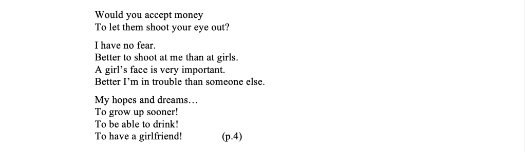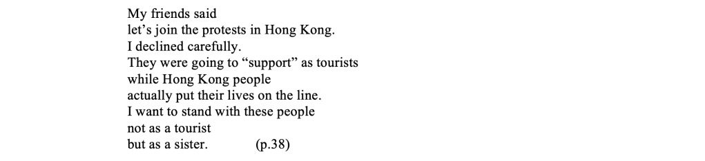 Those who read Chinese, even if not in Cantonese, might be curious to see the original, perhaps out of an urgent sense for documentation. But how then to “reach out across the silence of the oceans, through differences in language and culture”? (Foreword, p. x) As far as is discernible, I think the translations capture the moods, intensity, and lexical subtleties very well. For someone who reads Cantonese, and as an observer physically present in Hong Kong, I find myself nearly able to peer through the muslin of English to detect the outlines of what the original might have been. It could just be me, so do read it for yourself. For me, the feeling is one of trans-linguistic alexithymia, if such a concept is even sensible. The translations stir a recognition and yet, I found it hard to vividly make out the Cantonese words, although occasionally, I could nearly make out echoes resembling 我未來係點,都睇唔到, as in the final lines in this piece by a 14-year-old girl.
