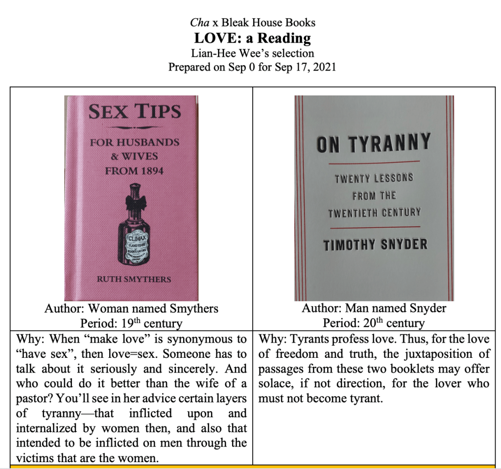 Lian-Hee Wee read excerpts from Ruth Smythers’s Sex Tips for Husbands & Wives from 1894 and Timothy Snyder’s On Tyranny: Twenty Lessons from the Twentieth Century (2017) alongside each other.