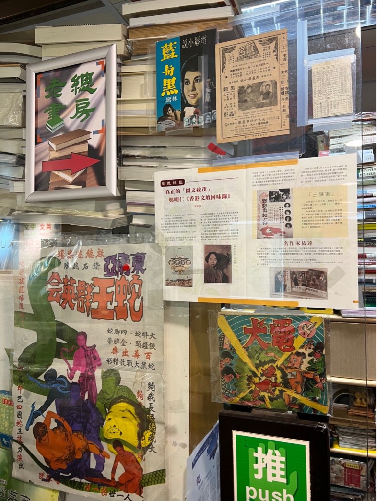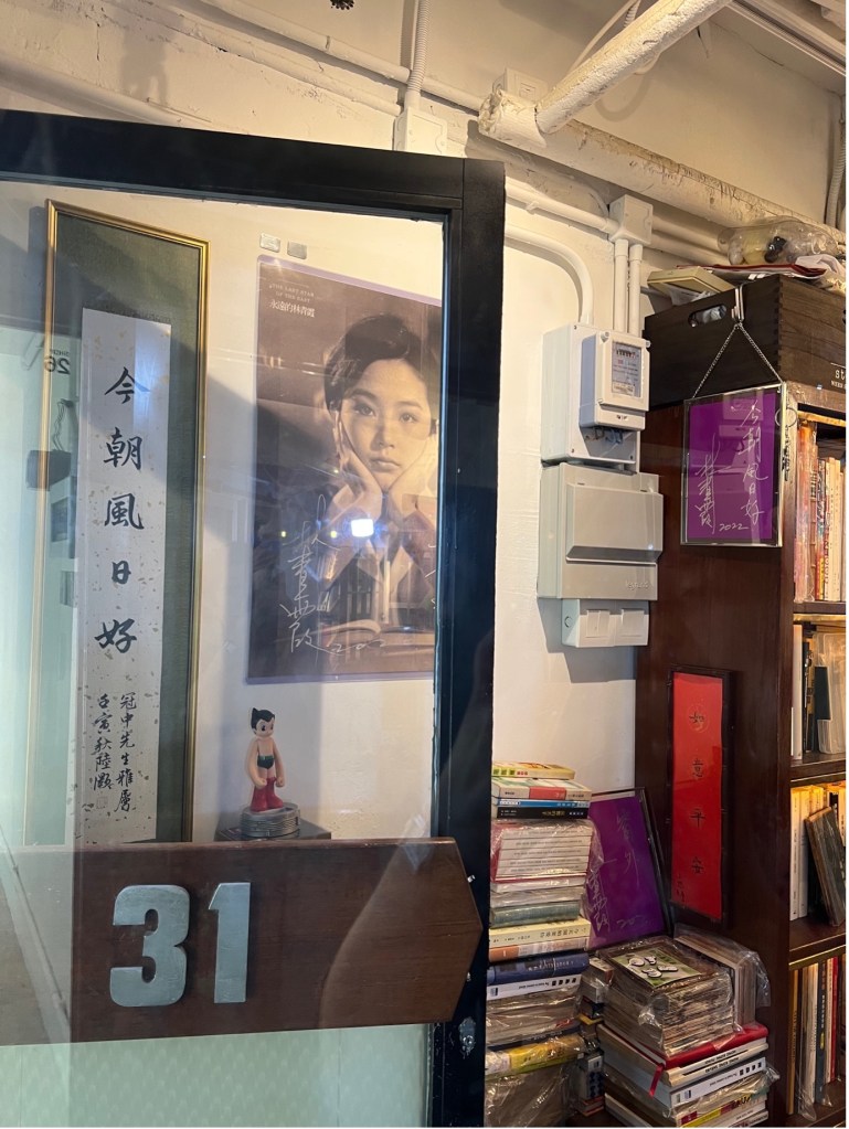The second stop of our adventurous book tour was again in one of the half-deserted malls in this neighbourhood. The small partitioned spaces in a quiet mall are rented at relatively low cost to individuals or small businesses such as the owner of this mosquito-sized 蚊型bookstore called “今朝風日好”, which might be translated as “It’s a breezy and sunny day today”. This tiny bookstore can barely accommodate more than two visitors at once. However, it is extremely resourceful and is frequented by scholars, and even celebrities such as the actress and writer Brigitte Lin 林青霞, whose autographed portrait greets visitors as they enter through the glass door.
