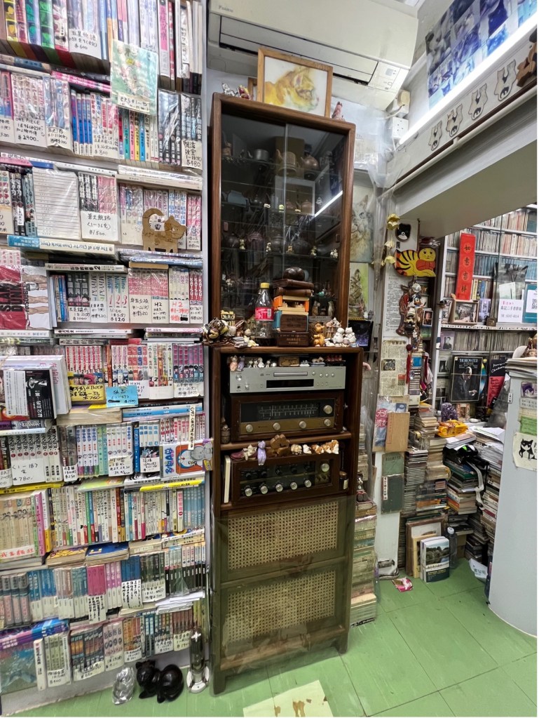 Our adventurous small tour ended at the spacious Sum Kei Bookstore selling both new and second-hand books. It has a strong and distinctive smell, from the more than twenty stray cats that the owner takes in for shelter and food. There are various reminders posted inside and outside this bookstore carrying similar messages: “This is first and foremost a bookstore, not a CAT-bookstore,” and, “Please do not play with the cats.” However, visitors are free to observe the feline-themed decorative objects and images scattered around.