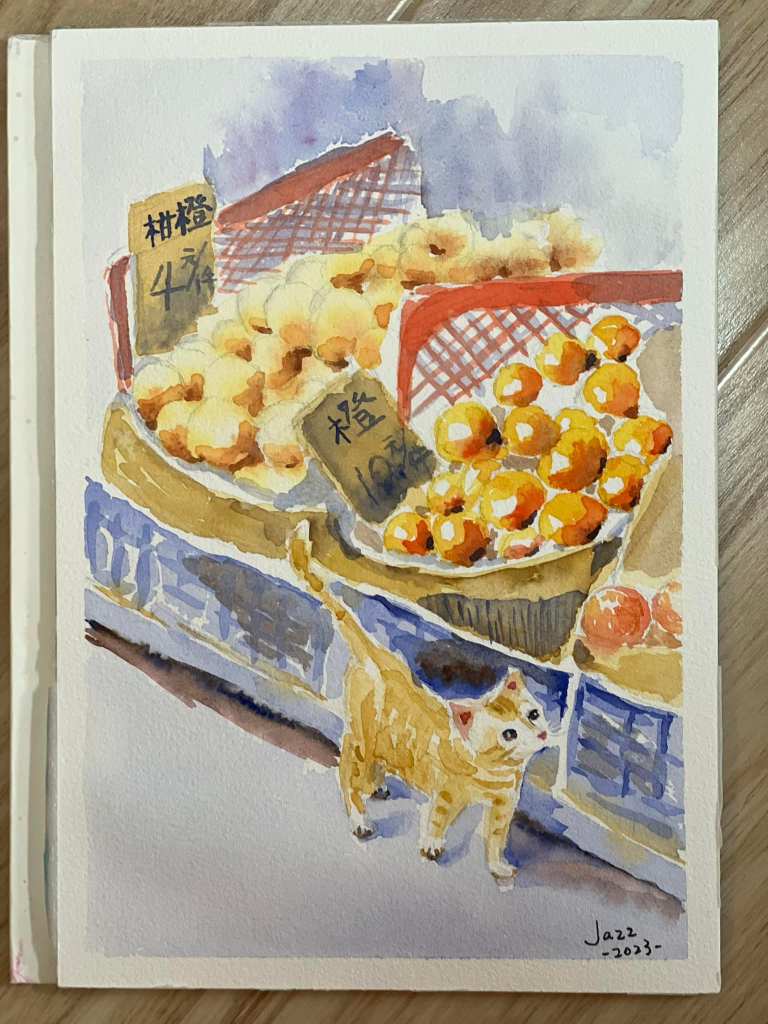 賣水果的人家本來是五口之家,夫妻兩人再加兩個女兒和一個小兒子,現在多了一隻小貓,他們管小貓叫 Mimi。有了名字就是一家人了。從來沒養過貓的他們在最初的歲月中都是本著「分甘同味」的方式來養 Mimi,把自己的食物分享給毛孩。Mimi 也是非常懂事,從來不給店舖添麻煩,白天時而爬上檐篷視察周圍環境,時而敏捷地穿梭在主人親手做的用來擺放水果的木架手推車之間,時而躲進紙箱避靜。勤奮的主人每天工作近二十個小時,Mimi 的身影漸漸變成鋪頭𥚃一種不可或缺的存在。