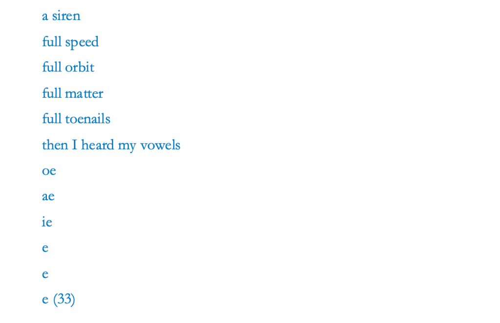 Across the speaker’s memory from the location in Saint Louis, Missouri, the speaker sees flocks of snow geese forming lines and patterns in the sky. Choi traces the flight passage of the snow geese as a metaphor in her “sky translation”, where she rewrites the birds’ transit patterns into pictographs of the letters “D, M, Z” (8). The letters, spreading across the page, form an image of birds migrating, where each letter is a bird in transit, and each letter a carrier of the severed name of the border zone “D, M, Z” across the sky. If Choi magnifies the font size to mime the threatening effect of the barricades at the border zone, she also demonstrates how words might be transformed into living creatures taking flight at different locations around the world. For birds, the borders that separate humans are non-existent. Hearing the snow geese’s call across the distance, the speaker imagines the birdsong to be the call from home: