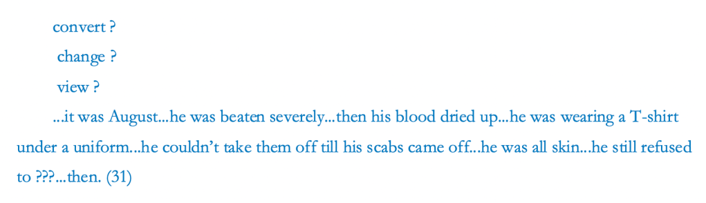 Rebuilding meanings from in the linguistic site of loss, pauses, and chaos as a translator migrating between the US and South Korea, Choi writes: “The language of capture, torture, and massacre is difficult to decipher. It’s practically a foreign language. What a nightmare! But as a foreigner myself, I am able to detect the slightest flicker of palpitations and pain. Difficult syntax! It may show up as faint dots and lines, but they’re often in blood, snow, and dandruff” (43). While broken narratives of tortured individuals conjure up an allegory of pain, Choi views the mode of translation as an “anti-neocolonial mode” (99), in which alternatives of words could be created to defy the language of torture, division and suppression. One of Choi’s variating approaches in reconstructing language from history is via the presentation of “mirror words”: