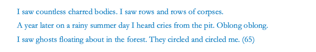 The poet’s presence moves among history, like a phantom without a face. “‘Hey, you there!’, ‘Commies.’, ‘YOU.’” (88)—These were the language of the mass “hailing” as the Korean War broke out in June 1950 and during the Sancheong-Framyang and Geochang massacres in February 1951, under Syngman Rhee’s dictatorship. Choi recasts the scene of terror by revealing photographs and official documents, then mimics the hailing by translating the forceful speech into an urgent call to interpellate the oppressors’ language—“Now look at your words in a mirror. Translate, translate! Did you? Do it again, do it!” (99). The exclamation mark compels the reader to recall the mad, violent course of history, dragging the reader’s gaze back to the page, to look at their own reflections, to witness the violence, and translate it into resistant language.