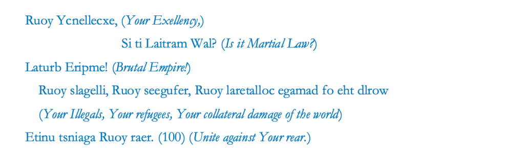 “Mirror words defy neo-colonial borders, blockades. Mirror words flutter along borders and are often in flight across oceans, even galaxies” (99), Choi writes. The idea of mirror translation in DMZ Colony extends the meaning of translation, and is in itself a poetic action, through which the poet acts as the programmer of the virtual mirror to reconfigure the texts from history. Through the display of inverted words, the poet disrupts the reading process, prompting the reader to re-imagine the stories of those who could no longer speak. As readers translate the mirror words back into their own languages, the traumatic past could be registered and re-scribed in the present.