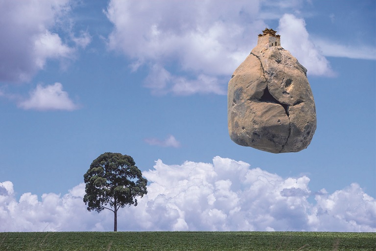 Huge cubes float in the air, painted with different images on each side. Above the clouds, we see René Magritte’s iconic painting The Son of Man, the cover of George Harrison’s album Somewhere in England, and one of Andy Warhol’s red lip prints. Human figures, in dark silhouette, are walking on the top of the cube. An aerial view of a green landscape appears far beneath the cubes. The clouds fill the gap between foreground and background, the atmospheric layer and the distant earth. Thanks to the realistic texture of the clouds, the depth of field is widened, rendering the photomontage not only a flattened collage but a three-dimensional aporia. This is one of the opening images of Hong Kong artist and photographer Basil Pao’s photo book Carnival of Dreams.