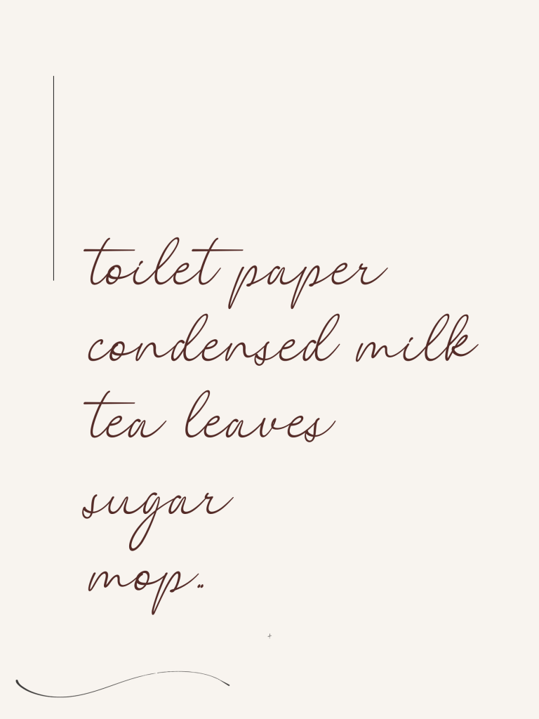 “How about I make us some breakfast?” I said as I pushed open the door again. After rummaging around, I could only find a jar of instant coffee. There wasn’t even sugar or milk, but Kwong found a cake in her handbag. She had bought it at 7-Eleven the previous morning, so the first meal in our new home was prepared. We sat facing each other with, each with a mouthful of cloying cake and bitter coffee. She told me that she had broken up with Bigfeet, and for a moment, I couldn’t bring myself to look at her. After a while, she picked a piece of paper off the floor and wrote on it: toilet paper, condensed milk, tea leaves, sugar, mop…