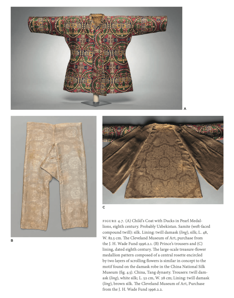 Just how complex all this can become is shown in the story of a child’s coat (Figure 4.7). The outer layer and lining are both woven in a pattern. The outer (shell) layer is multi-coloured while the inner one is monochromatic. Both Chen and the Cleveland Museum of Art, which owns the coat, are in agreement that the lining fabric was made in China. However, Chen suggests that the shell fabric was made in Tibet, while the Cleveland Museum of Art attributes the shell fabric to Sogdia in modern-day Uzbekistan. But both are in agreement that the coat was intended for a Tibetan prince and was found in Tibet.
