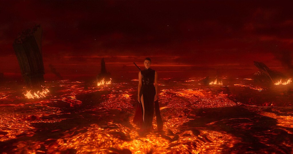 Less fleetingly, we meet Sea Shimooka, who is of Japanese, Native Hawaiian and French descent. Going by a glance and her in-show accent, you can’t place her anywhere on the globe. This is ideal, because she plays the synthetic alien envoy, Sophon. In his novels, Liu Cixin styles Sophon as Japanese with a capital J. The Netflix adaptation plays a more complicated game. Here, Sophon retains her katana but does not wear a kimono. Instead, she’s wearing a dress that does show some East Asian influences, but is also ultimately unplaceable. It’s subtle, secular, and appropriate to the mood and character—but the source text’s open embrace of national-signifiers has paid its due. The resulting character is a novel and striking hybrid; so visually arresting that she was used to dominate the show’s teaser trailers. I know I won’t be the only one to long remember the sight of Sophon striding over magma. I hope that in the coming seasons there will be more hybrid design and decision-making. As in biology, much of cultural evolution is driven not by lone prodigies plucking novelties from the ether, but through the chaotic recombination of existing elements—therein lies potential for enormous creativity.