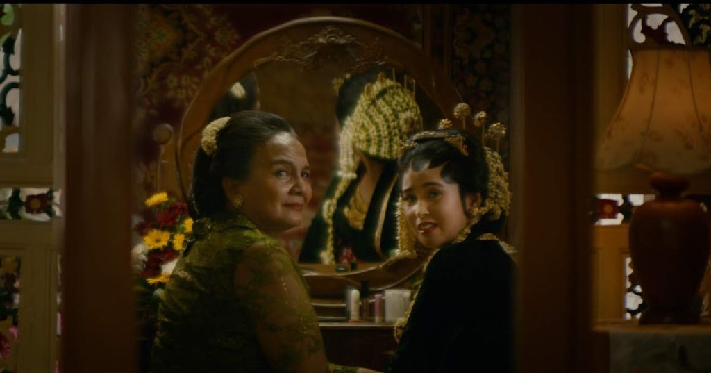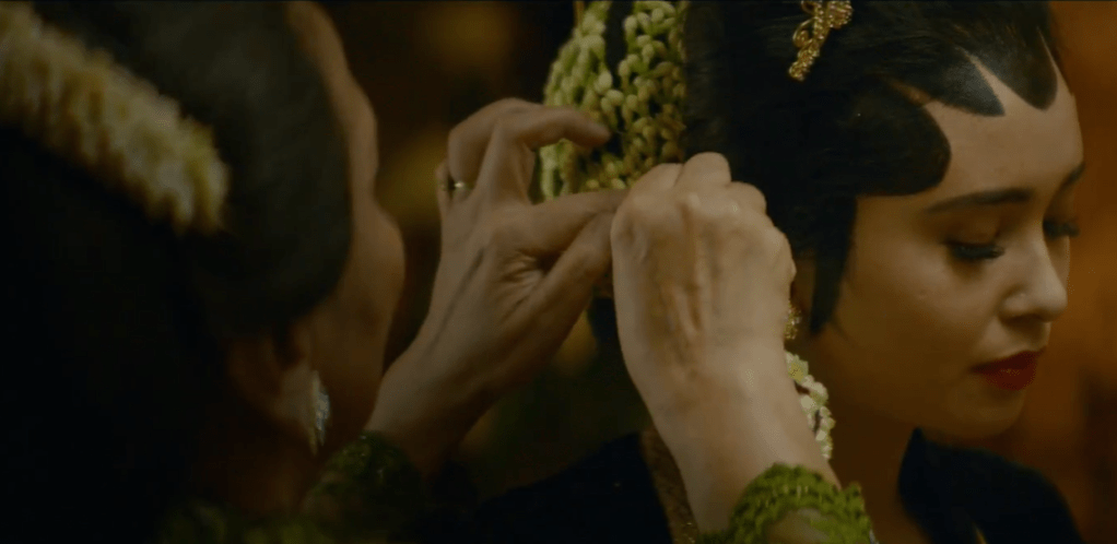 That Suryaโs film centres on a contrast between public and private, and between spectacular and intimate, creates space for the dramatic tension surrounding the transition in gender roles accompanied by marriage. The filmโs opening scene of a ceremonial procession is presented in a warm colour palette, with the edges of the frame blurred to heighten focus on the procession itself, with a prayer being broadcast over a speaker. The long shots of the procession through narrow bridges and alleys give way to medium shots of mother (Christine Hakim) and daughter, firmly establishing this contrast between public spectacle and private tenderness. The intimacy of the conversation between mother and daughter, juxtaposed with the brideโs ornate attire and the officiousness of the procession, lays out marital expectations for their conversation takes place away from the scrutiny of the weddingโs guests, strengthening a sense of dramatic ironyโthat concerns and reassurances are absent from the transactional vows exchanged by the fathers of bride and groom. The camera pans out to reveal that their backs are turned to this betrothal, further foregrounding this sense of ceremonial elision.