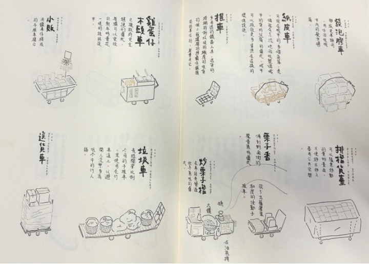 Pattern, Language, Setting—A Glossary of City Spaces in Hong Kong is an interdisciplinary attempt to observe patterns weaving the city’s fabric by the collective in.light.of.living—three anonymous creatives. The book shares similarities with an academic publication, consisting of an introduction, methodology, and findings. Disguised within this structure is a light and engaging bilingual read. Bridging the two versions are over 20 thematic photographic evidences, indexes, and a spatial glossary. The glossary functions much like a picture dictionary, containing 453 sets of hand sketches and calligraphy. Each item is assigned an arbitrary identification number, yet items, types of people, and activities of similar nature or relevance are listed together.