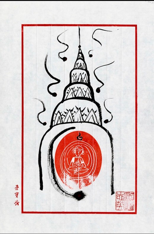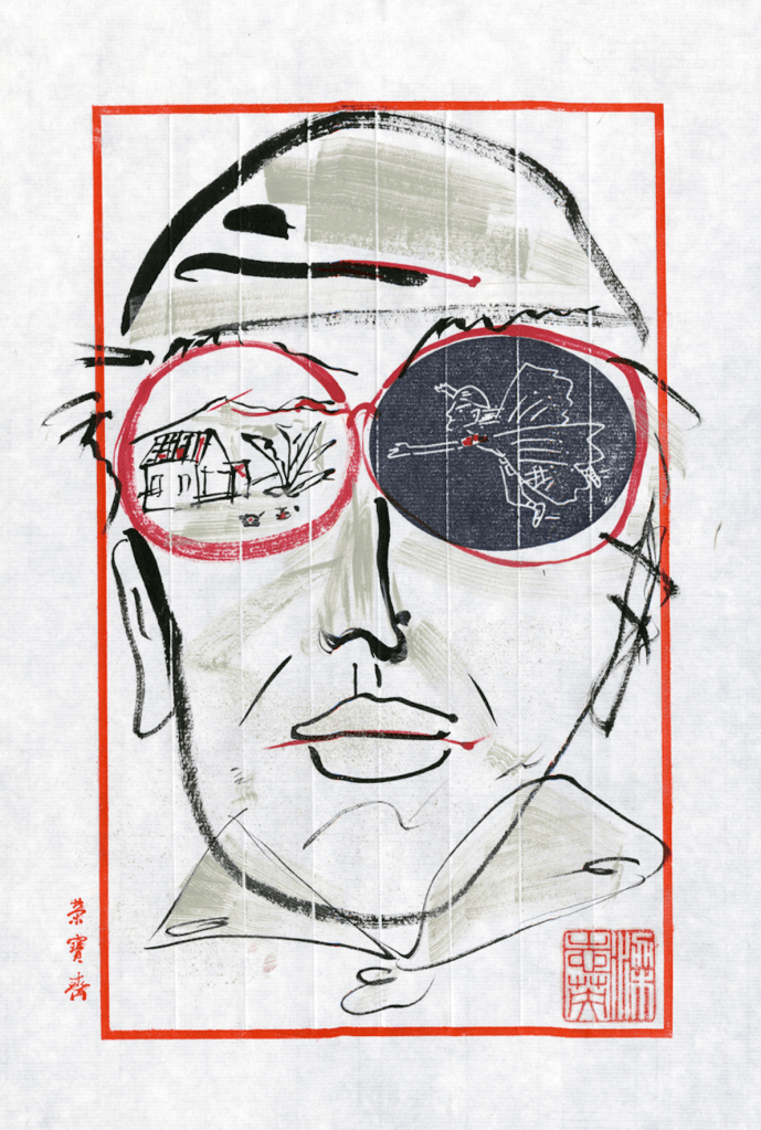 Ink, brush and stamp graphic by Russell Leong for “Delayed Tongue”.