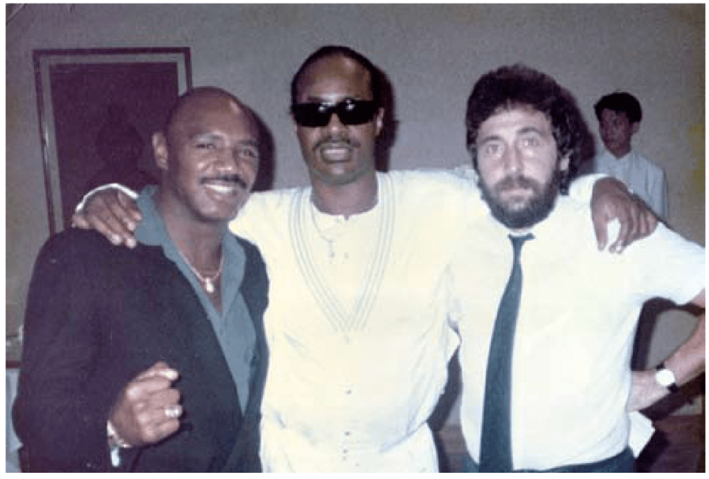 “I just called to say I love you,” Derek Currie (right) with Marvelous and Stevie Wonder before they sang at the Hong Kong Hotel.
