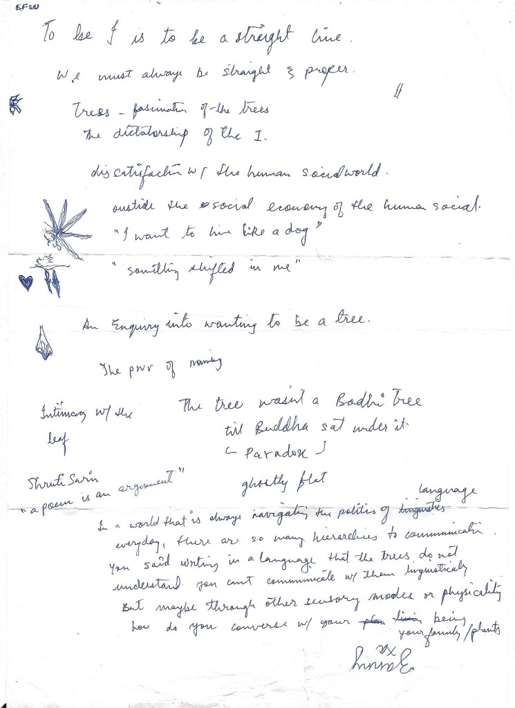 A scan of Gauri Yadav’s notes from the day of the lecture “Shapes of Trees and Hidden Knowledge Systems” at St. Stephen’s College.