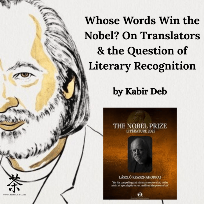 How to cite: Deb, Kabir. “Whose Words Win the Nobel? On Translators and the Question of Literary Recognition.” Cha: An Asian Literary Journal, 12 Oct. 2025, chajournal.blog/2025/10/12/nobel.