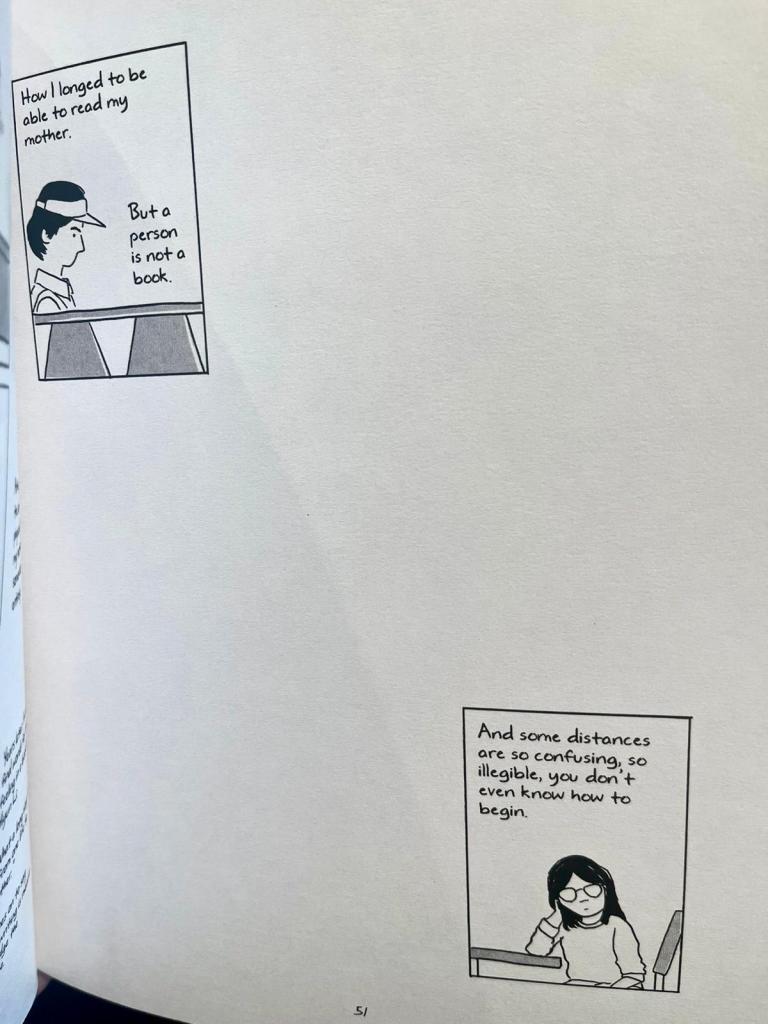 Wong also explores her Chinese-ness, or her perceived distance from her heritage, which deepens the emotional divide between herself and her mother. Her use of blank space and wordless panels heightens this vastness even further. Wong often highlights her lack of Chinese proficiency as a central reason she and her mother struggle to understand one another, adding to the difficulty of uncovering the answers she most seeks: “Where did I come from?” “Where are we going?”
