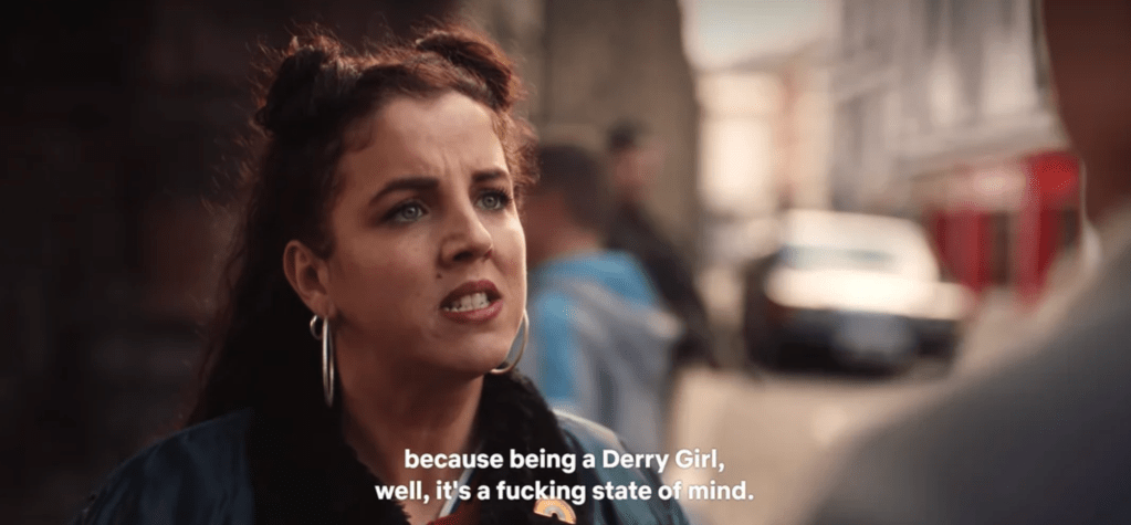 In one episode of Derry Girls, Michelle shouts at her cousin James, who is frequently bullied for being British, “Being a Derry Girl, well, it is a state of mind.”1