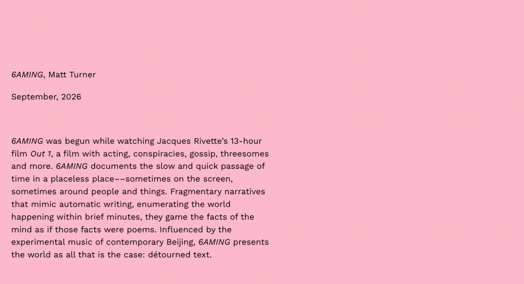 When I approached Tammy Lai-Ming Ho at Cha about running a portfolio for my forthcoming book of poetry, 6AMING (September, 2026), my only hope was that a handful of poems might appear online “gallery style”, as print magazines with a poem-a-page layout and no commentary once described it. I did not expect to be given the rare opportunity to complement, or even embellish, the poems with an essay. I therefore took some time to consider the invitation. I had written essays on architecture, music, politics, translation, other people’s poetry books, and the visual arts, but never on my own work. Given the opportunity, I decided to discuss some of the themes and contexts of 6AMING, focusing on the series “6AMING”, from which the accompanying poems are taken. In addition to “6AMING”, the manuscript also includes a long not-poem, “103 Times” (more on that term later), as well as a short note on the poems. I suppose this short piece functions as an extratextual supplement, rather than a conventional essay.