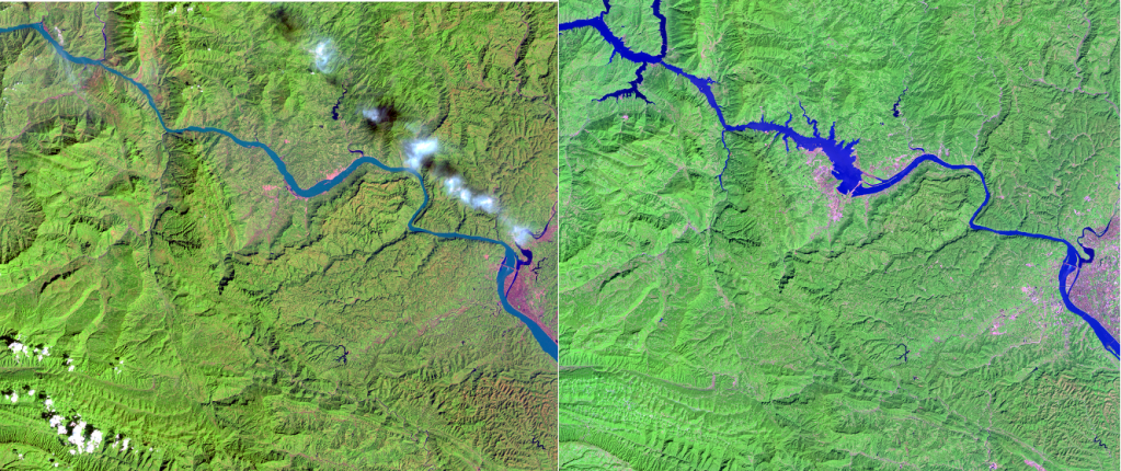 Satellite imagery of the reservoirs created by the Three Gorges Dam on the Yangtze River. Left: 1993. Right: 2021. Via