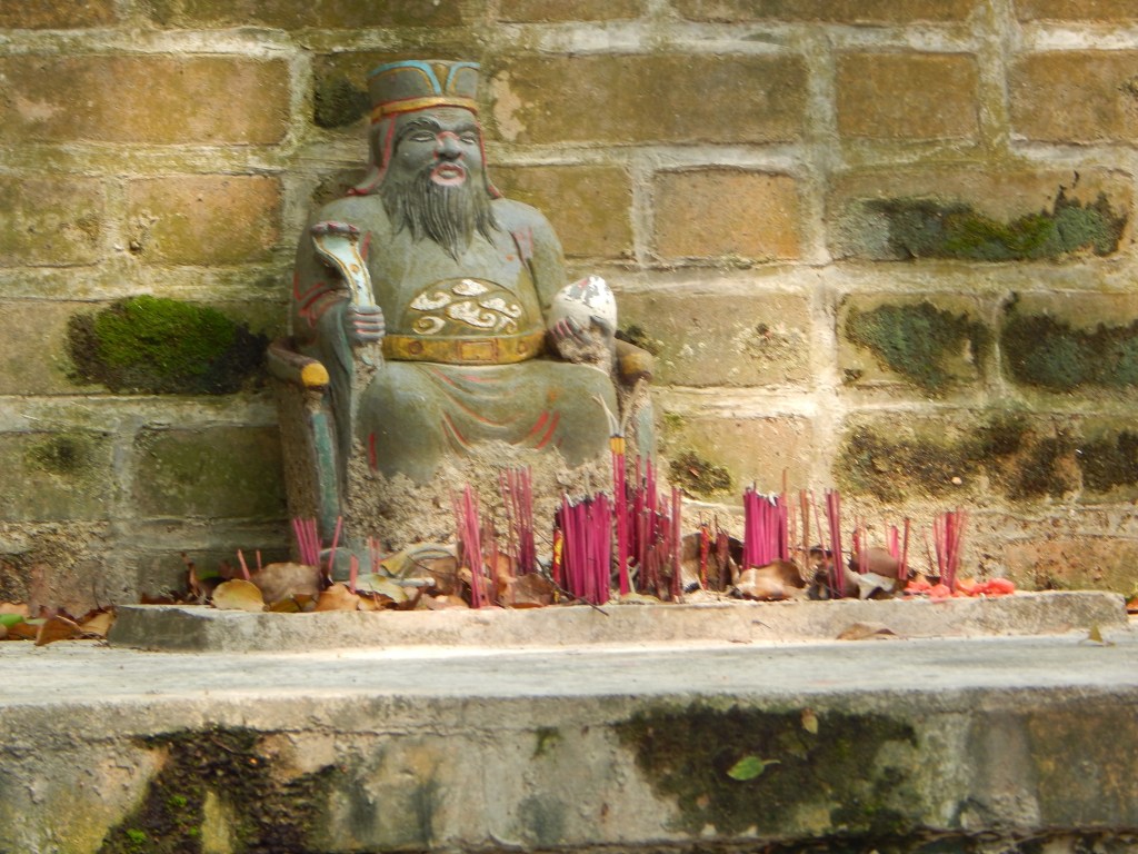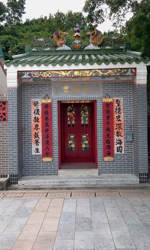 More modern versions of such shrines often make room for other gods. I saw one near one of the Cafeteria Beaches in the vicinity of Sam Shing Hui that comprised three floors. A plaque to the Earth God, closest to the earth, occupied the ground floor. A figurine of the Goddess of Mercy, Koon Yam, stood on the first floor, and above her was a niche reserved for the martial deity Kwan Tai, his bristling black beard waving to and fro in the stiff sea breeze.