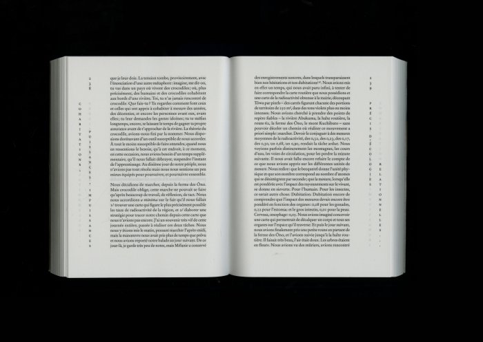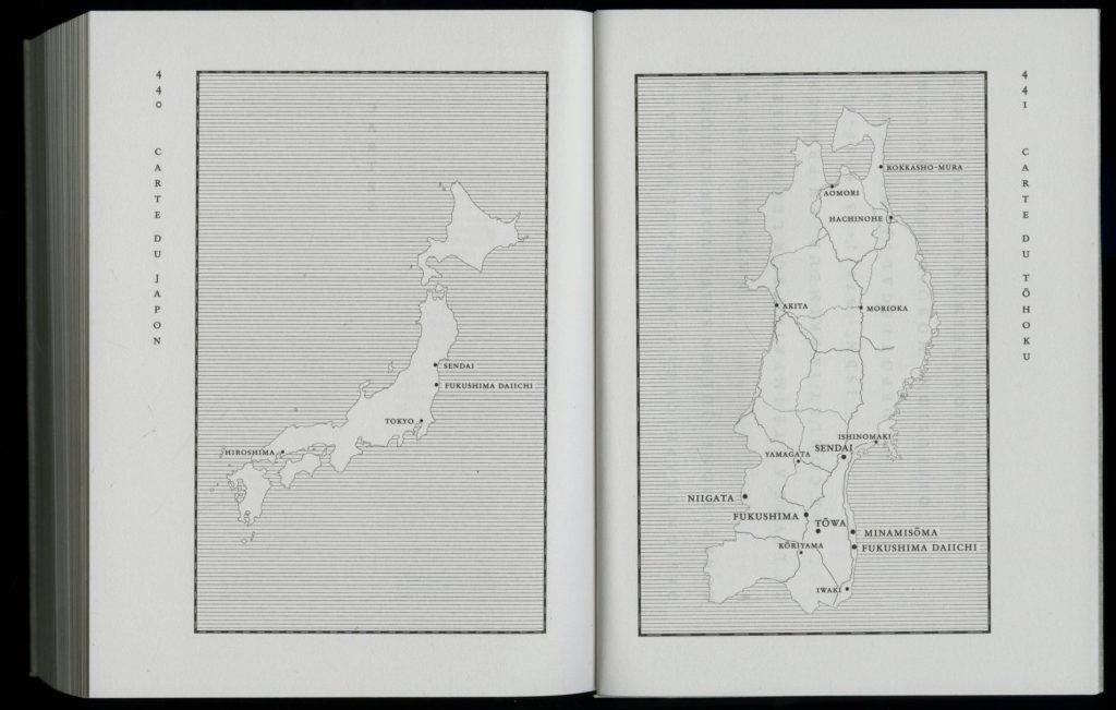 That the titles and running titles, which usually allow one to enter a book and move from one chapter to another, one section to another, are here graphically blocked, and that their layout in columns or vertically prevents them from running, is by no means insignificant. The whole point of the book, which deals obliquely with the Fukushima nuclear accident and directly with daily life in a world contaminated by low doses of radioactivity, is precisely to try to identify and describe an event that will not pass, that stubbornly refuses to pass, despite all attempts, whether from the state, industry, the media, or the weariness of the inhabitants themselves, to turn the page and move on.
