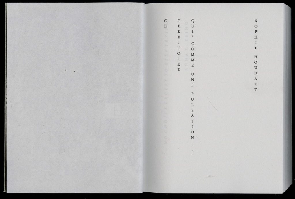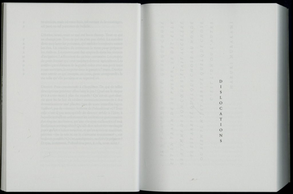 On the tracing paper wrapping the cover, the book’s title and the author’s name are printed in black and arranged in four columns; they are read from top to bottom, letter by letter, vertically. The same applies, inside the book, to the titles that open and delimit the four sections of the work: “Dislocations”, “Consistances”, “Cohabitations, Powers, Powerlessnesses”, “Reprises and Setbacks”.