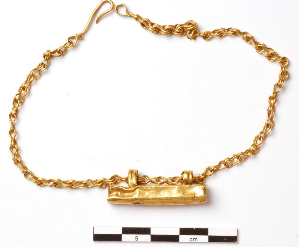 Chain and pendant case containing a gold tablet incised with a Greek alphabetic text guiding the owner to the underworld, sometimes described as an Orphic inscription. More information.
