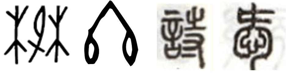 From left to right are the oracle bone script (jiaguwen, used in 1250 –1050 BC) for “春” (spring) and “冬” (winter), and small seal script (xiaozhuan, used in 500 BC – 200 AD) for “詩” (poem) and “愛” (love).