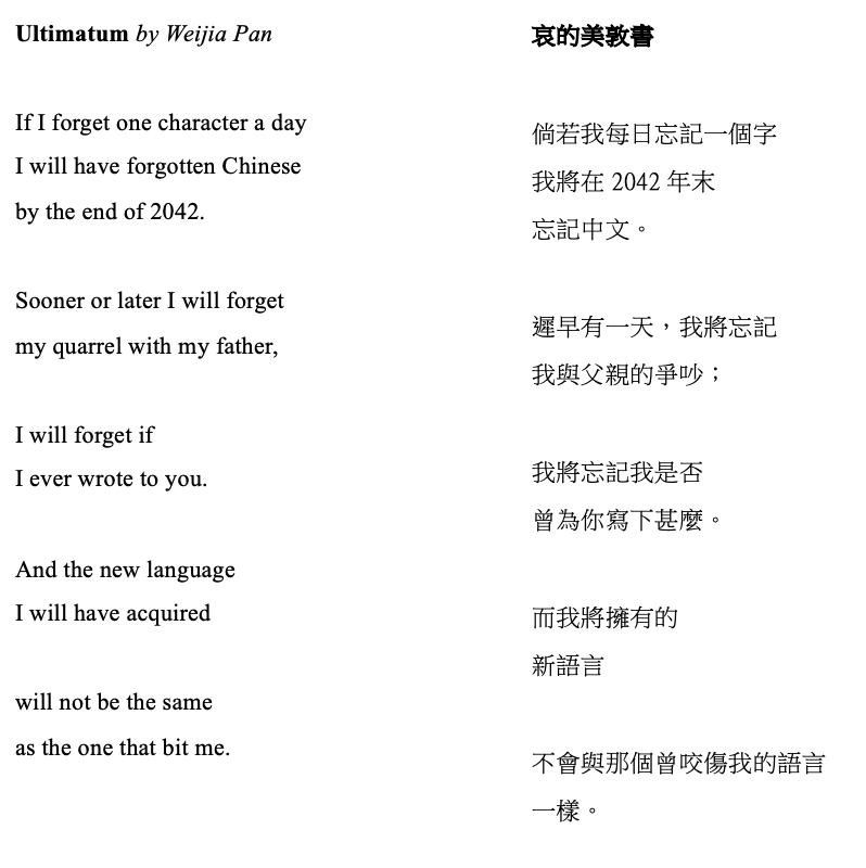 Lastly, let us generate mirror words for a poem. I recently translated Wijia Pan’s “Ultimatum” from Motherlands, a poetry collection written in English, his second language, about Chinese:7
