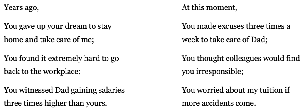 Ma, all the medical knowledge you acquired was meant to prepare you to become a doctor. At that time, you went to the hospital with Dad three times a week. You had spent years learning the definitions, causes, symptoms, and treatments of “hypertension”, “diabetes”, and “uremia”. You used all the biological and medical terminology you had mastered over the years to discuss his illness and treatment with his doctor. Yet you were not his doctor. You were his wife.