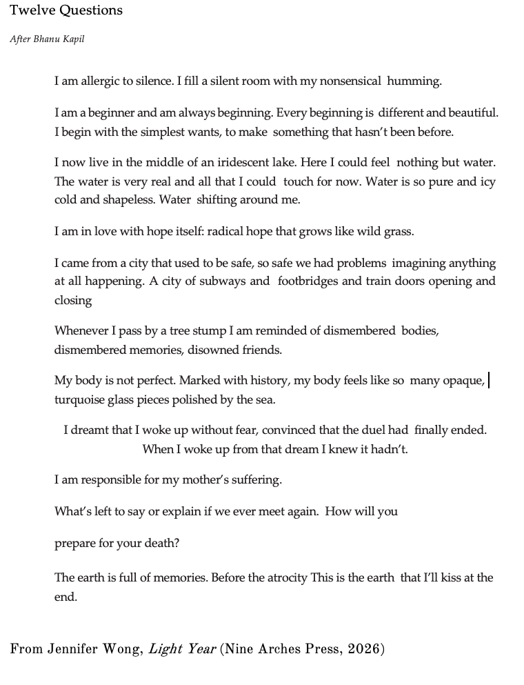 Jennifer Wong. Light Year, Nine Arches Press, 2026. 72 pgs.