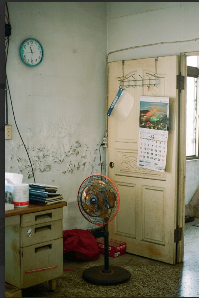 This negotiation between distance and proximity has become more pronounced in the evolution of her art. If In Passing is rooted in friendship and the drifting, provisional quality of youth, Echoes confronts disappearance. Begun around 2020 and further developed when Wang returned to her childhood home in Pingtung, southern Taiwan, the series documents the interior of a house that has since been demolished. In these photographs, the space is devoid of inhabitants. Instead, I encounter sofas and lunar calendars settled into the corners of rooms, worn kitchen surfaces with dishrags and a rice cooker, a portable fan oscillating in a doorway as the clock reads 11:30. Wang describes a deliberate decision to remove people from the scene, yet I do not experience their absence as a void. The spaces seem to retain the forms of those who once passed through them, whether leaving for good or simply stepping away to fetch a glass of water.